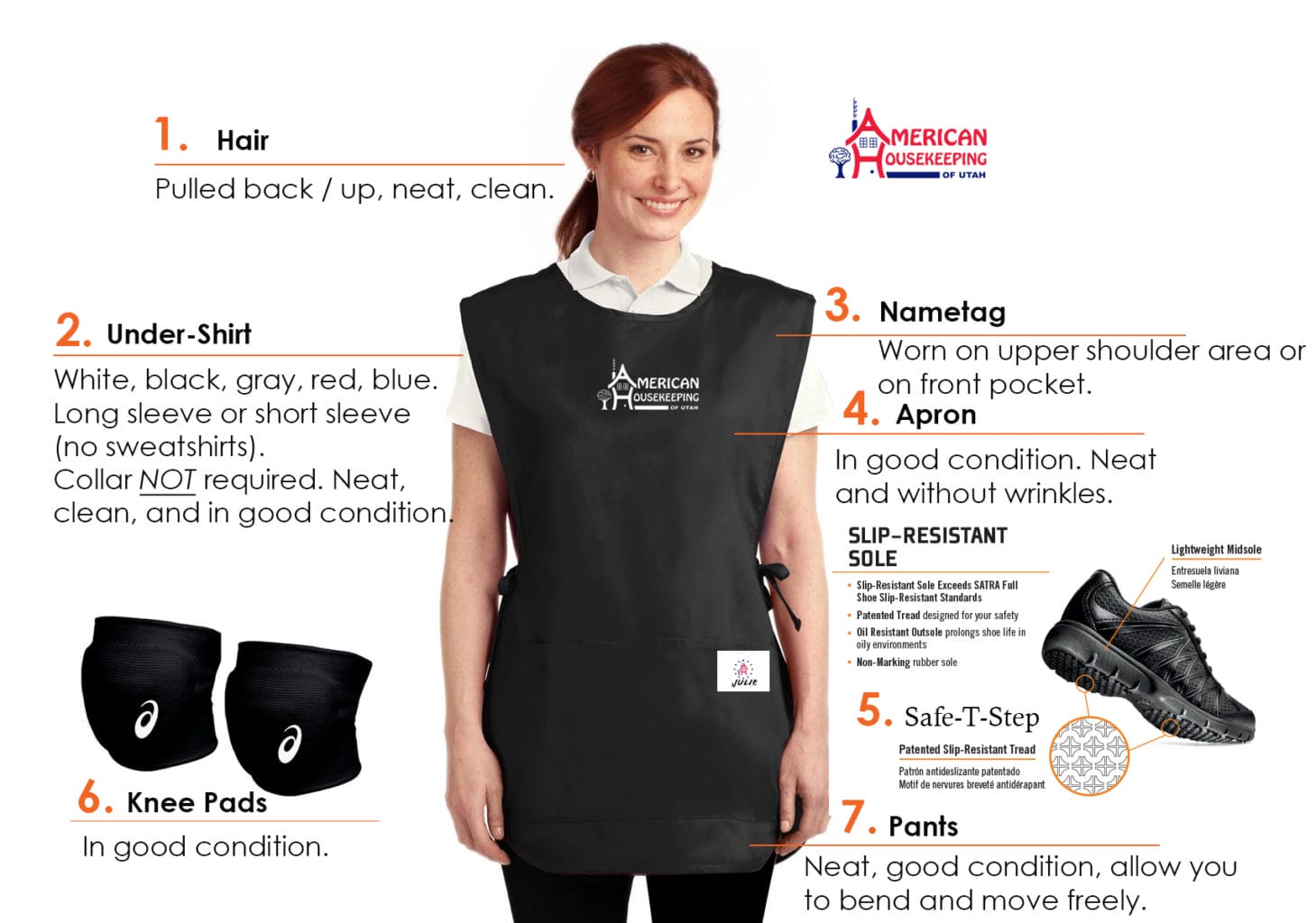 - Uniform: Navy Apron or other company provided shirt must be worn prior to arriving at any client home and remain on until after you have left the jobsite. Apron should be tied to fit snug and comfortable.